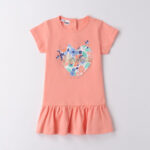 Abito estivo bambina iDO da 9 mesi a 8 anni realizzato in jersey 100% cotone. Il modello presenta apertura sul retro con bottoni, balze sul fondo e stampa cuore. Lunghezza sopra al ginocchio