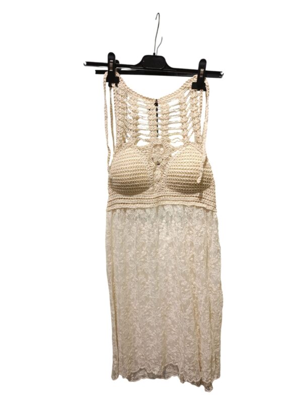 Corpetto lavorato all’uncinetto con coppe sagomate e dettagli intrecciati sul décolleté.