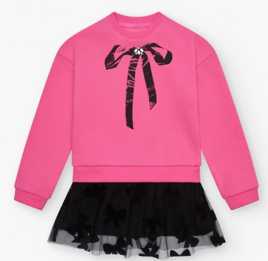 Abito da bambina in un vivace colore rosa, decorato con un elegante fiocco nella parte superiore. La gonna in tulle nero con dettagli a fiocco aggiunge un tocco delicato e sofisticato. Realizzato in un tessuto morbido e confortevole, questo abito è ideale per occasioni speciali o per dare un tocco chic ad ogni giornata. Appartiene alla raccolta Poesia Magica