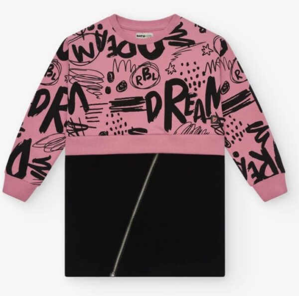 Abito in felpa con sorprendente stampa graffiti nei toni del rosa e del nero. Questo modello unisce lo stile di una felpa con la comodità di un abito, caratterizzato da una chiusura con cerniera diagonale che aggiunge un tocco moderno. Ideale per un look urbano e audace. Appartiene alla collezione Rebel Dreamers