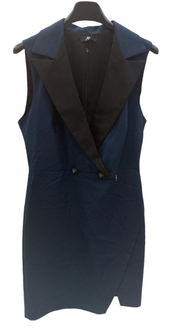 Abito donna smanicato Ake’.Presenta scollatura a V e cerniera lampo sul retro,in tinta unita con collo color nero e applicazioni a bottoncini frontali.