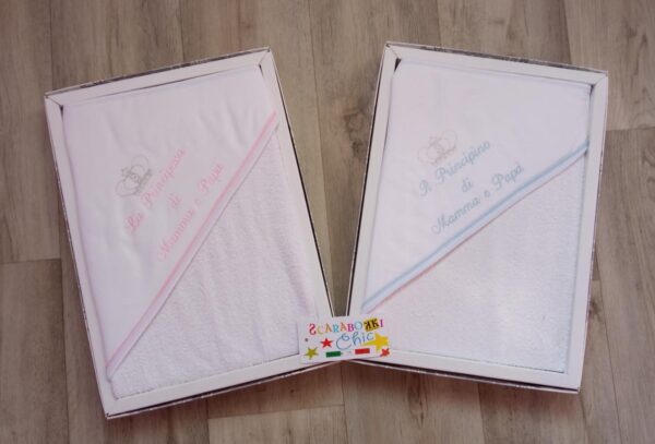 CON RICAMO ” IL PRINCIPINO DI MAMMA E PAPA’ ” , ” LA PRINCIPESSA DI MAMMA E PAPA’ ”
