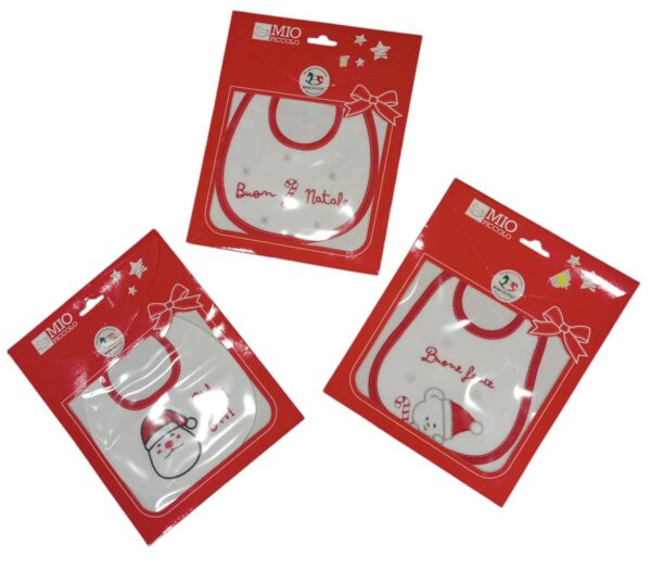 Bavetta natalizia neonato/a in 100%ciniglia.Fondo bianco con diverse stampe a tema natalizio e bordo rosso.