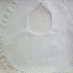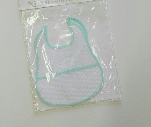 BAVETTA NEONATO TUTTA BIANCA, A FORMA PERA, CON BORDI COLORATI E TELA IDA APPLICATA PER RICAMI.