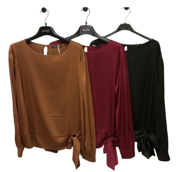 Blusa donna curvy satinata.Presenta scollatura a giro,apertura a bottoncino sul retro,bottoncino ai polsini e dettaglio nodo laterale.