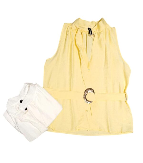 BLUSA SMANICATA CON CINTURA DECORATIVA E DETTAGLIO GIOIELLO