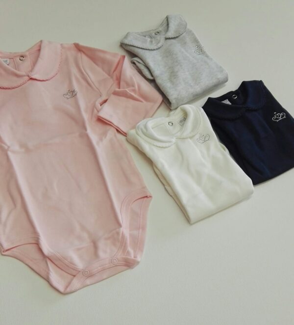 BODY PER NEONATI, MODELLO POLO, CON CORONA DI STRAASINI APPLICATI SUL PETTO.