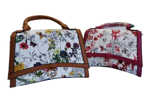 borsa in fantasia floreale, con manico e tracolla rimovibile.