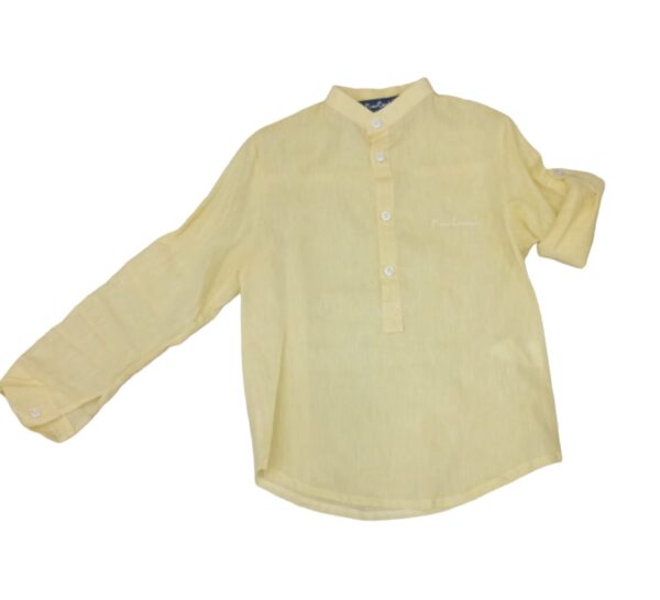 Camicia in lino bambino Pierre’Cardin con collo alla coreana e bottoncini alle maniche.