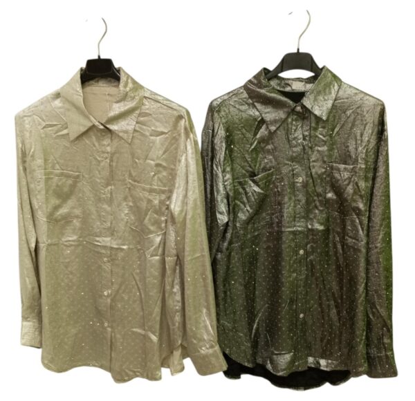 Camicia donna con strass in taglia unica.Si presenta a tinta unita tempestata di piccoli strass color argento,taschini frontali e dettaglio bottoncini frontali e sui polsini con strass.