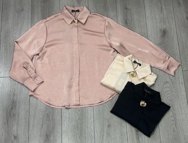 Camicia da donna dal taglio raffinato, realizzata in tessuto satinato leggermente lucido che dona un effetto elegante e femminile. Il design minimal è impreziosito da una spilla gioiello dorata sul colletto, dettaglio sofisticato che valorizza il capo e lo rende perfetto sia per look da ufficio che per occasioni speciali.