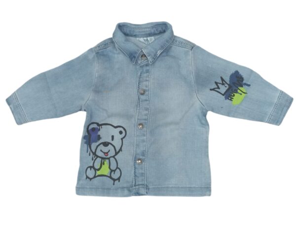 Camicia denim neonato IDO,con stampa orsetto frontale destra,stampa a scritta sul braccio sinistro e sul retro.