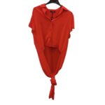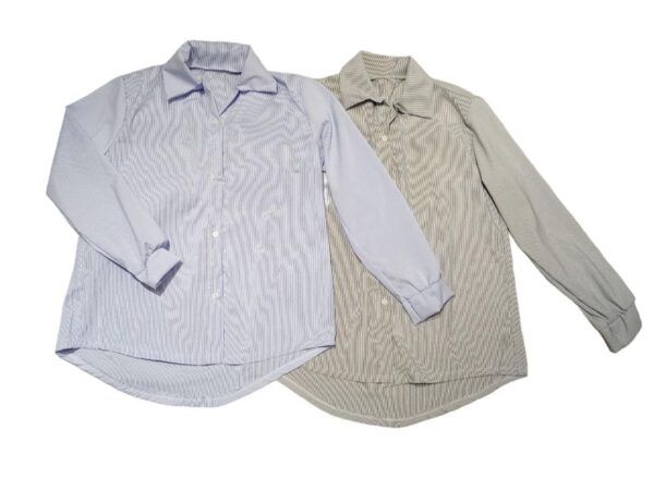Dettaglio di collo a punta e apertura frontale con bottoni.