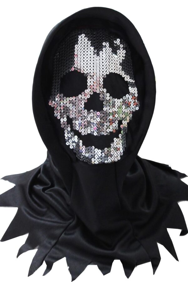Cappuccio Horror Con Maschera Paillettes Argento Accessorio Di Carnevale