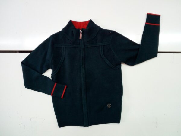 CARDIGAN VERDE CON CERNIERA E COLLO INTERNO ARANCIONE.