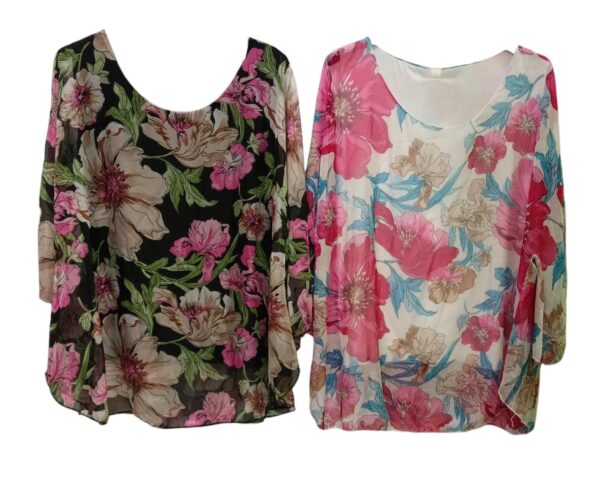 Fresca casacca a tema di fiori, realizzata in viscosa adatta alla calda stagione.
