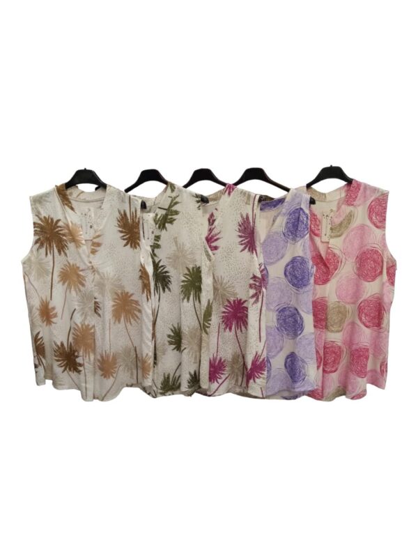 Il capo, a fantasia, è smanicato e presenta un collo alla coreana.