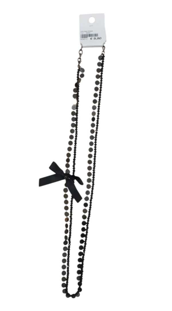 COLLANA DONNA LUNGA,A DUE FILI CON PERLINE COLOR NERO E DETTTAGLO FIOCCO.