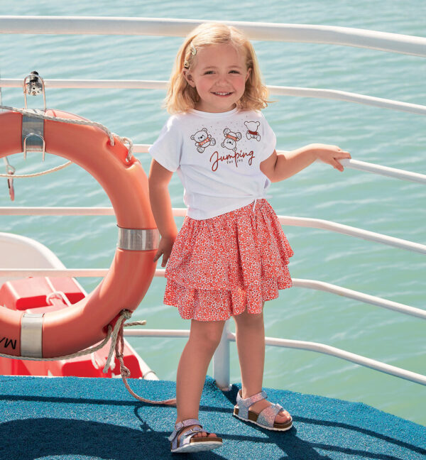 Grazioso completo iDO per bambina composto da t-shirt e gonna realizzato in jersey stretch di cotone. La maglietta ha stampa orsacchiotti con applicazione di strass e dettagli lurex. Nodo davanti. La gonna ha fantasia a fiorellini. Lunghezza sopra al ginocchio. Scopri tutta la selezione di Completi bambina iDO sul sito!