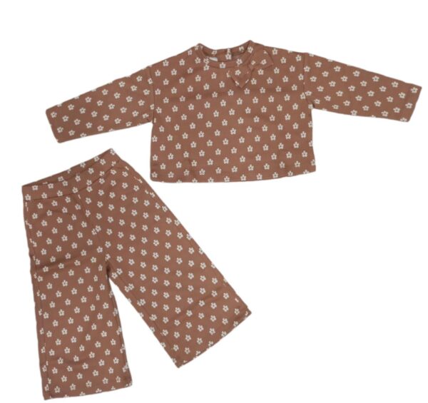Completo 2 pezzi bambina IDO.Il completo e’in cotone garzato ed e’composto da maglia cropped con apertura a bottoncini sul retro e dettaglio fiocco su lato sinistro e pantalone a palazzo.