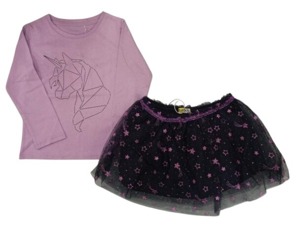 Completo 2 pezzi bambina Losan.Il completo e’composto da:gonna in tulle con elastico in vita,in tinta unita blu navy a fantasia stelline glitterate color viola;maglia in cotone a tinta unita con scollatura a giro e stampa frontale con glitter color argento.