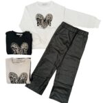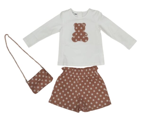 Completo 2 pezzi +pochette bambina IDO.E’composto da t-shirt in cotone con scollatura a giro,apertura a bottoncini sul retro e stampa frontale orsetto con dettaglio fiocchetto in rilievo e short in cotone garzato con elastico in vita a fantasia fiori,in dotazione pochette con tracolla a catena color oro.
