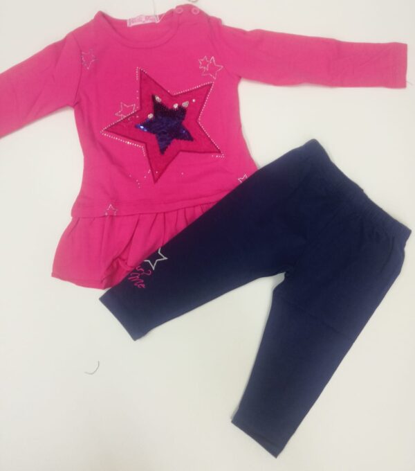 COMPLETO BIMBA 2 PEZZI IN COTONE MANICA LUNGA CON APPLICAZIONI DI STRASS GIRABRILLA E PIZZO FANTASIA STELLE.