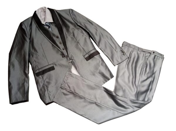 Il completo si asrticola di : giacca, pantalone, gillet, cravatta e camnicia in colore bianco.
