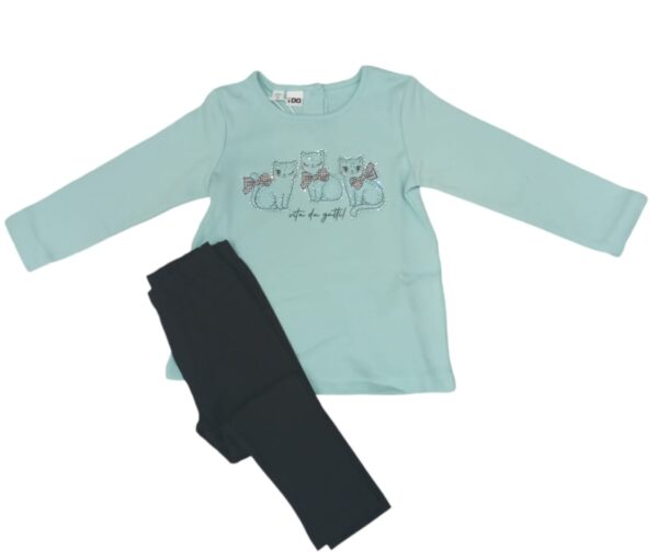 Completo bambina Ido,composto da t-shirt in cotone con apertura a due bottoncini sul retro e stampa gattini e leggins lungo in cotone.