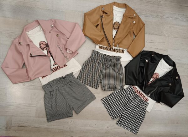 CHIODO IN ECOPELLE, MAGLIA IN CALDO COTONE CON STAMPA SUL DAVANTI E SHORTS A QUADRETTI
