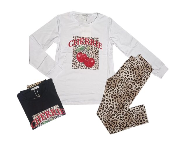 La maglia a manica lunga presenta una stampa con ciliegie glitter e sfondo animalier con scritta “CHERRIE”, abbinata a leggings leopardati super trendy.