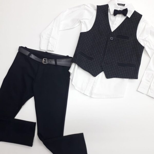 COMPLETO BAMBINO QUATTRO PEZZI. CAMICIA BIANCA IN COTONE, GILET BLU A QUADRI CON BOTTONI E TASCHINI, PAPILLON BLU E PANTALONE BLU ELASTICIZZATO CON TASCHINI E CINTURINO.