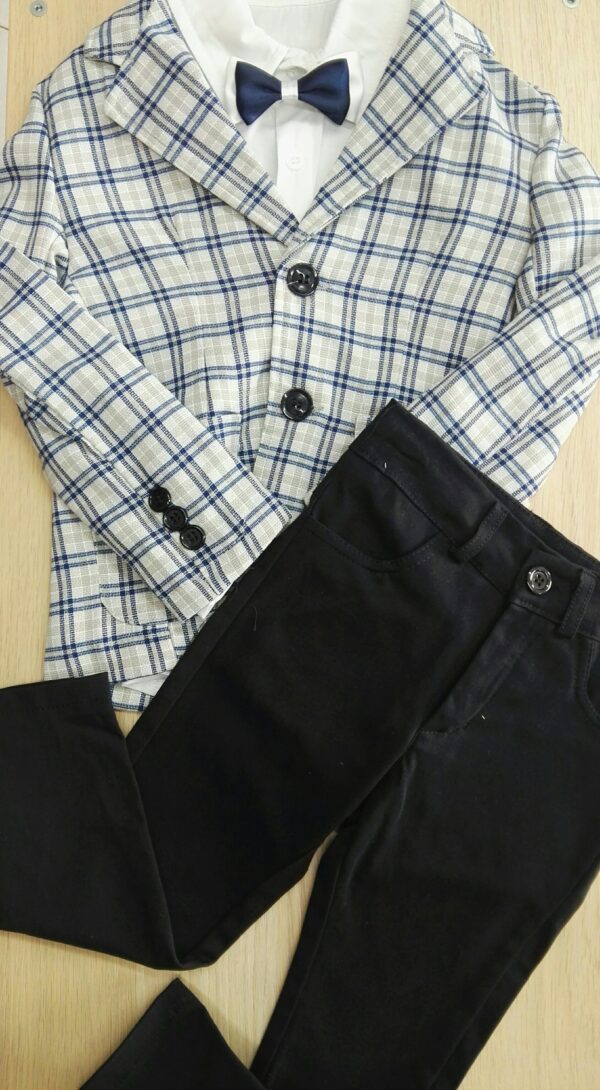 GIACCA A QUADRI + CAMICIA MANICA LUNGA TINTA UNITA + PANTALONI + PAPILLON