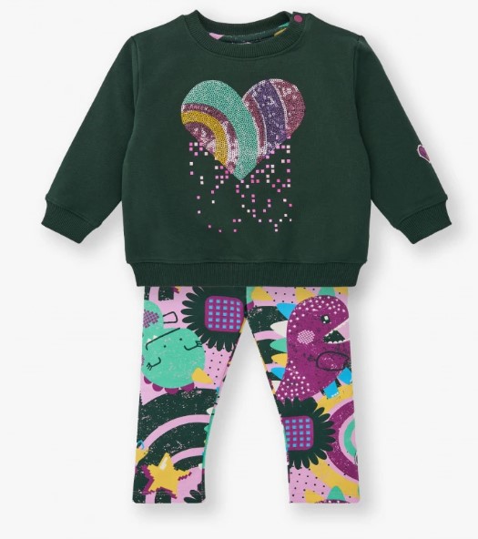 Set da bambina composto da felpa verde e leggings stampati che catturano l’essenza divertente e colorata della collezione Cyber Dino. La felpa si distingue per un cuore decorato con paillettes multicolor, mentre i leggings presentano una vivace stampa che unisce dinosauri, fiori e stelle nei toni del viola, verde, rosa e giallo. Dalla vestibilità morbida e confortevole, la felpa include dettagli grafici che aggiungono un tocco di brillantezza al look. I leggings, realizzati in tessuto elastico, assicurano comfort e libertà di movimento. Questo set è perfetto per creare un outfit completo ed elegante per ogni occasione. Appartiene alla collezione Cyber Dino