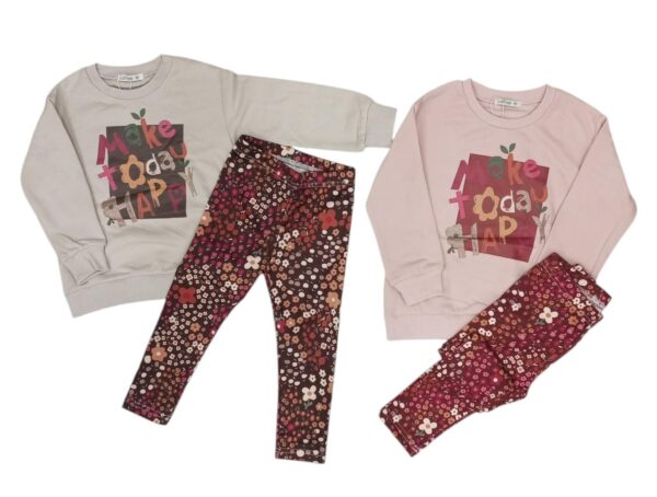 Completo 2 pezzi felpato bambina Lollitop.E’composto da felpa in tinta unita con stampa frontale e dettaglio glitter e leggings felpati a fantasia fiori.