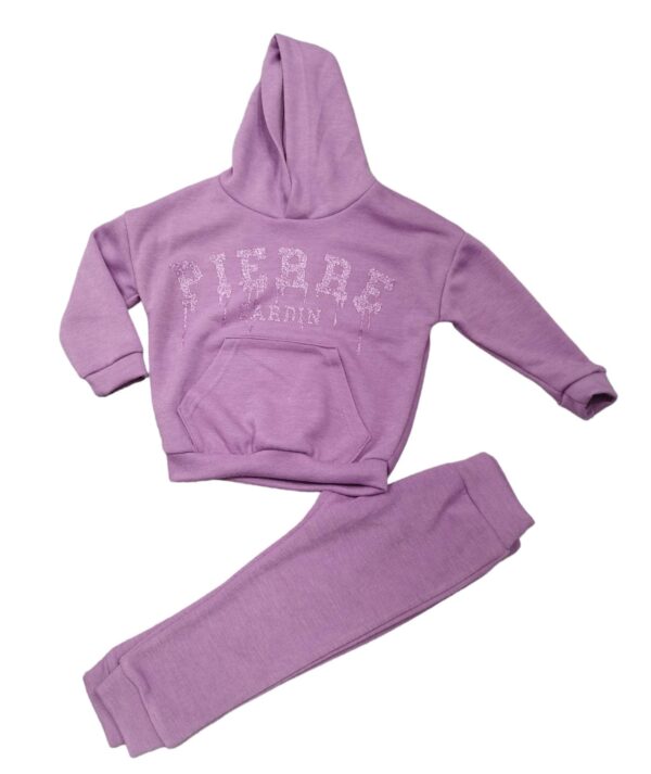 completo in morbida felpa composto da felpa con cappuccio , stampa glitter logo pierre cardin, tasche anteriori, elastico in vita.