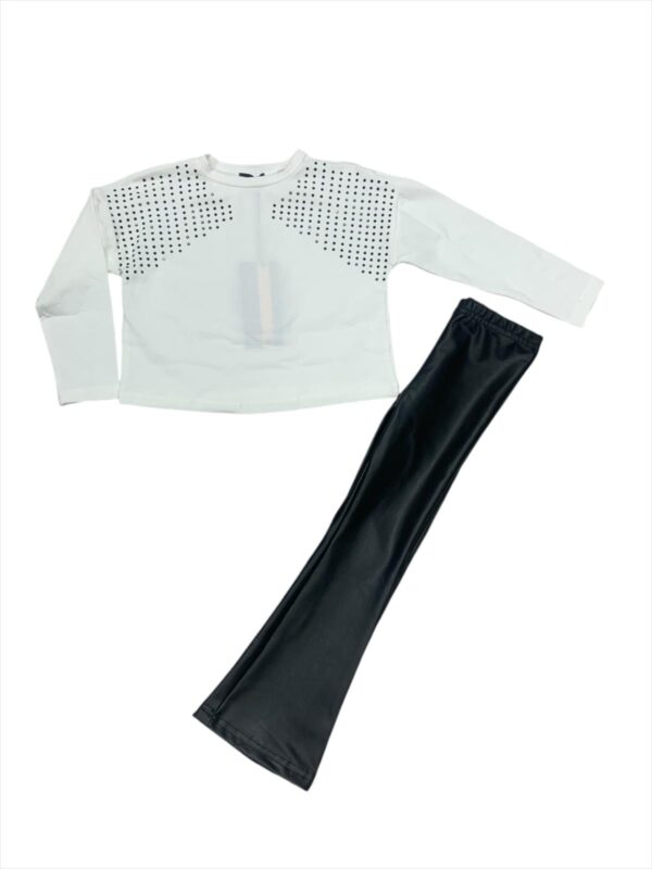 completo 2 pezzi con felpa in caldo cotone con applicazione strass, pantalone in ecopelle a zampa di elefante. leggermente felpato all’interno.