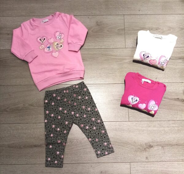 Il set presenta una felpa con stampa centrale e un leggings a fantasia.