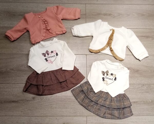 Il coordinato si compone di vestito a manica lunga con giacchino abbinato.