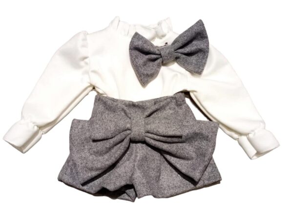 maglia felpata all’interno , tinta unita con colletto arricciato e spilla a forma di fiocco