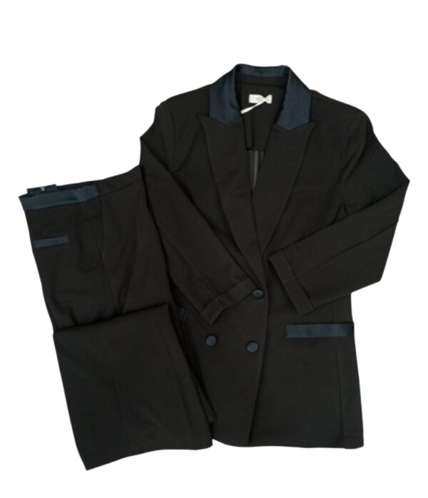Completo donna 2 pezzi,composto da giacca con apertura a doppio petto con bottoncini rivestiti in raso,spalline interne e finte tasche,pantalone a zampa con apertura a cerniera sul retro,finto taschino posteriore e tasche a filetto sulla parte anteriore.