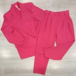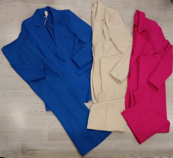 giacca con bottone centrale e finte tasche, pantalone modello a zampa