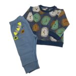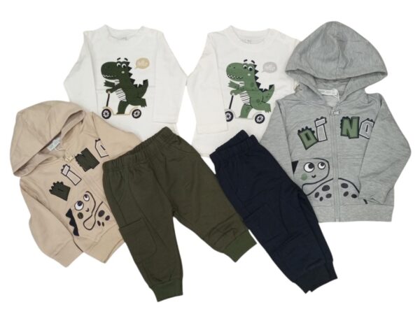 Completo 3 pezzi felpato neonato.Il completo e’composto da felpa con zip,cappuccio e polsini,tasche a marsupio e stampa dinosauro frontale;la maglia a manica lunga in caldo cotone con stampa dinosauro frontale e apertura laterale a bottoncini;il pantalone a tinta unita con elastico in vita,polsini e tascone laterale.