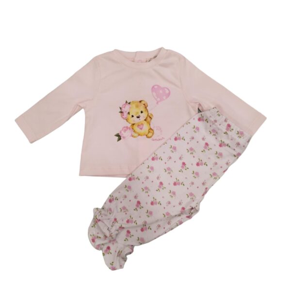 completo due pezzi composto da maglia in cotone stampato tem a orsetto, leggings con piede stampato tema floreale in coordinato.