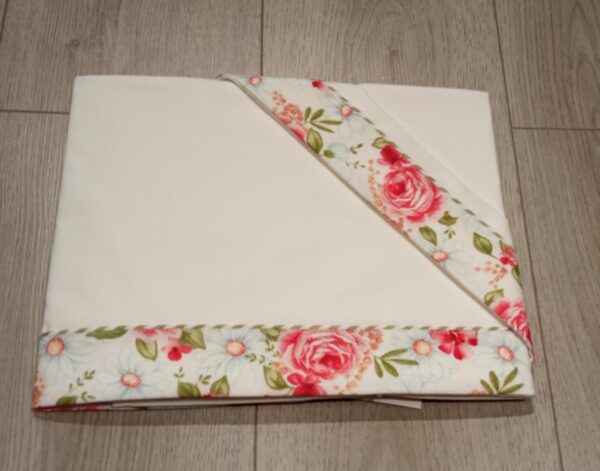 set lenzuola carrozzino composto da sopra sotto con elastici e federa cuscino per bimba tema floreale in coordinato con copertina in puro cotone mod co1830 e vestina in lino mod ve1891