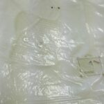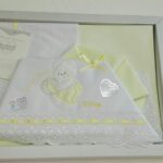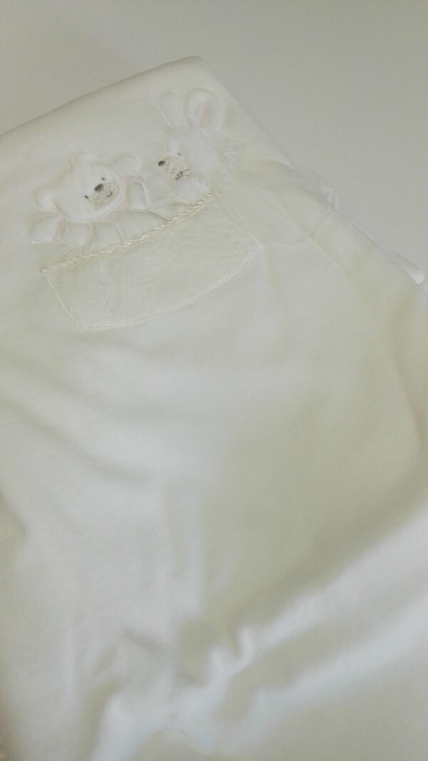 COPERTA CON RICAMO DI UN ORSETTO E UN CONIGLIETTO E VESTTITINO IN TULLE APPLICATI.