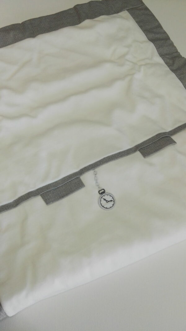 COPERTA NEONATO CON RICAMO DI UN OROLOGIO DA TASCHINO E BORDINI COLORATI.