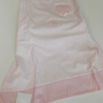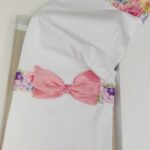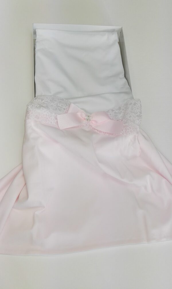 COPERTINA JERSEY META’ BIANCA E META’ ROSA CON TULLE ROSA RICAMATO APPLICATO AL CENTRO E FIOCCO ROSA IN TESSUTO CENTRALE.