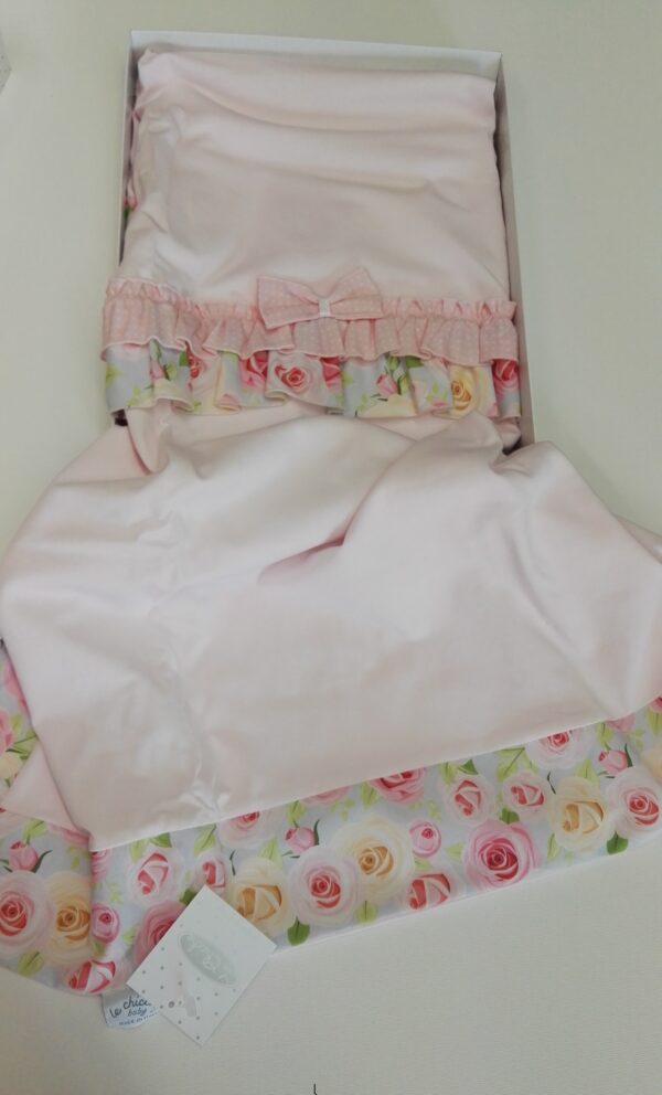 COPERTINA JERSEY CON VOLAN CENTRALE A FANTASIA FLOREALE E FIOCCO APPLICATO ED ESTREMITA’ FANTASIA FLOREALE.