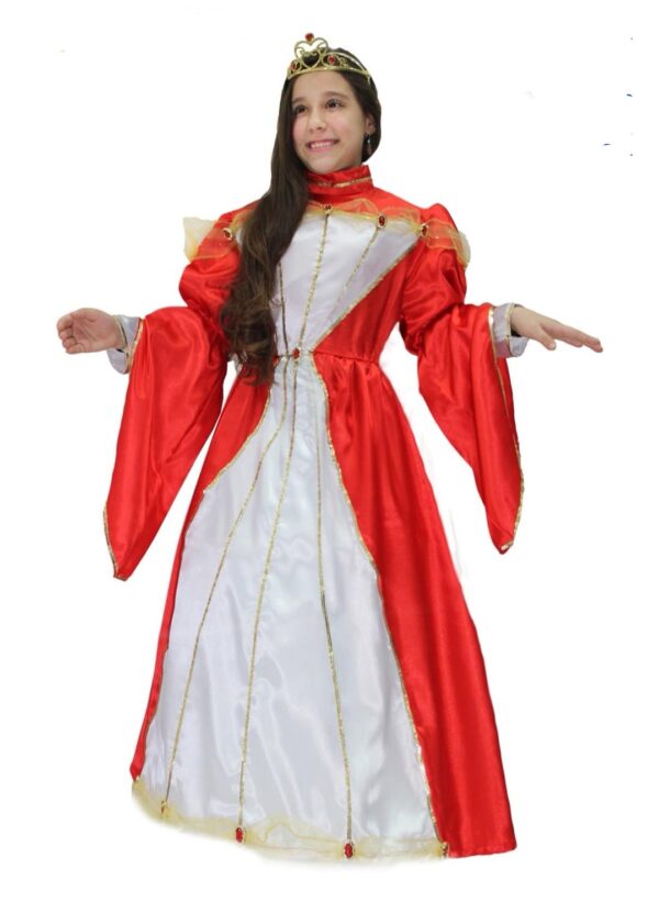 Designer Italiano: vestito lungo in raso rosso e bianco alla parte anteriore, arricchito con decorazioni in filo di paillettes oro e una strato di tulle arricciato sul petto. Per concludere troviamo una coroncina in plastica colore oro con delle applicazioni pietra rosse.